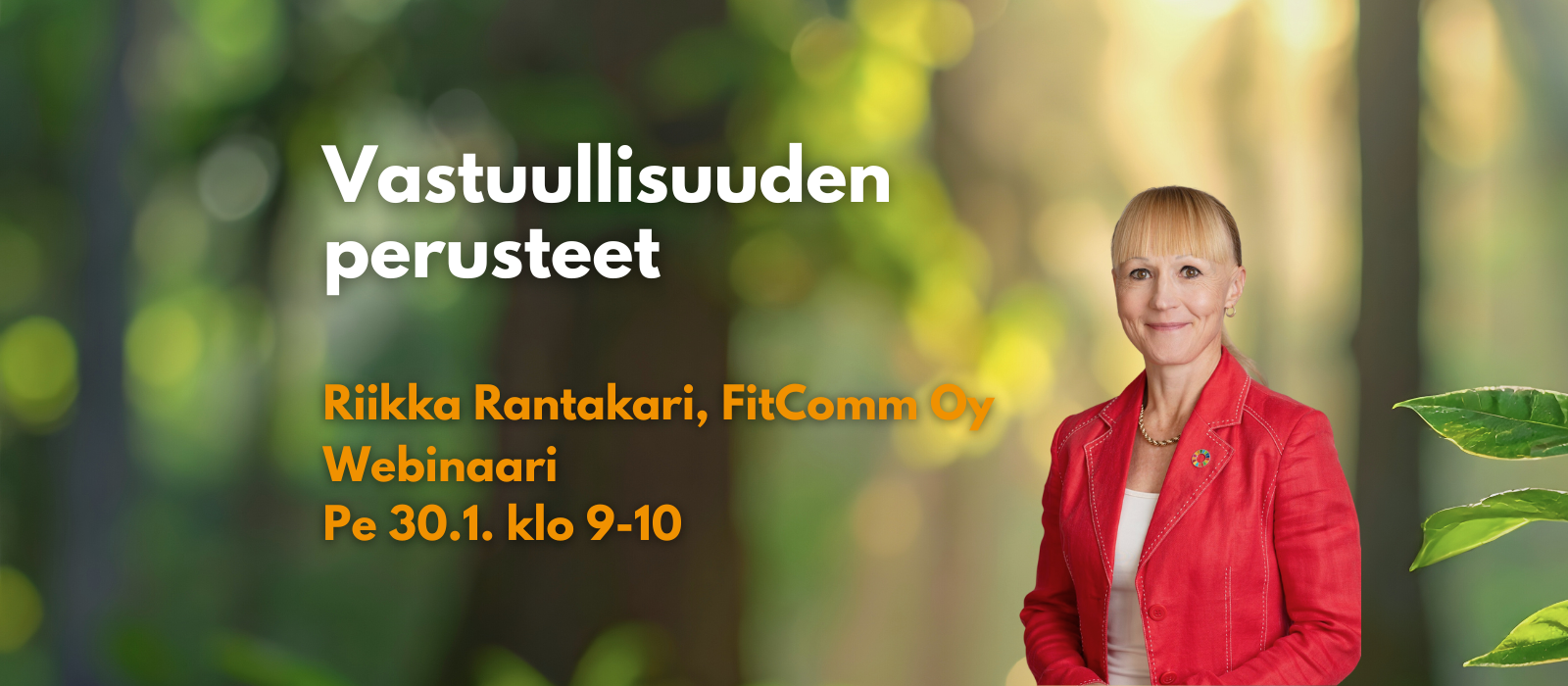Webinaarien asiantuntijana toimii FitComm Oy:n perustaja ja toimitusjohtaja Riikka Rantakari. Rantakari on työskennellyt yli 25 vuotta kestävän kehityksen ja vastuullisuuden parissa. Hän on ollut mukana lukuisten yritysten ja organisaatioiden vastuullisuuden kehittämisessä sekä vastuullisuusasiantuntijana useissa monialaisissa hankkeissa. Riikka toimii myös mentorina sekä muun muassa viestinnän ammattilaiset ProCom ry:n kestävän kehityksen verkoston puheenjohtajana, ProComin vuosikertomuskilpailun vastuullisuustuomarina ja Liikunnan kehitysyhteistyö LiiKe ry:n hallituksen puheenjohtajana. FitComm Oy on vuonna 2010 perustettu vastuullisuuteen erikoistunut asiantuntijatoimisto.