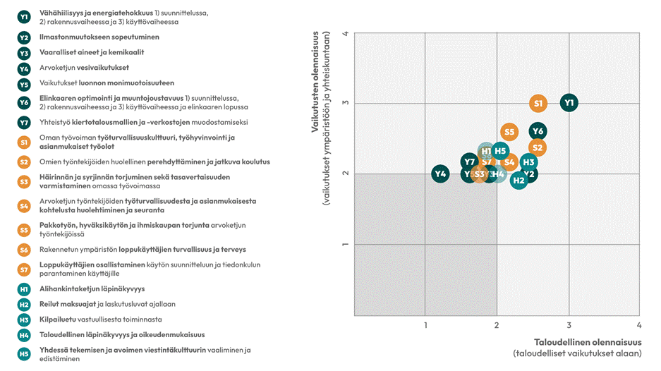 Viimeisen työpajan ja työpajan ulkopuolisten sidosryhmäkeskustelujen jälkeen rakennusalan pk-yrityksille muotoutui olennaiseksi yhteensä 23 vastuullisuusaihetta. Näin ollen koko olennaisuusanalyysin prosessin tuloksena alussa tunnistetut 183 vastuullisuusseikkaa kiteytyivät lopulta vain näihin 23:een olennaiseen teemaan.